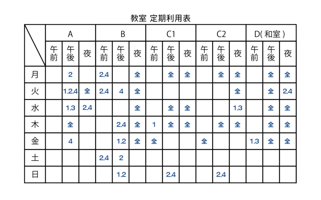 教室貸出は、上記表の午前・午後・夜間の時間単位で承ります。